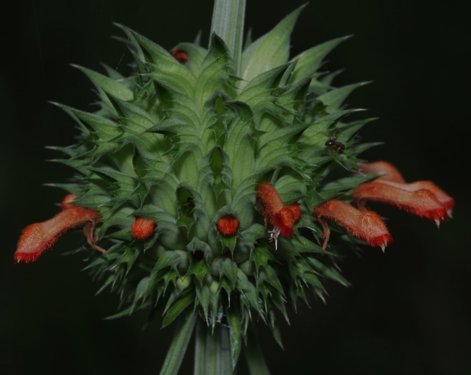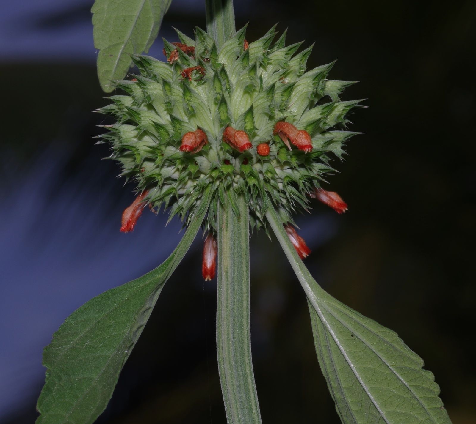 Leonotis nepetifolia , plante dressée dépassant ici 1 mètre (jusqu'à 3 m dans la littérature), caractérisée par ses inflorescences sphériques à fleurs rouges/oranges. Cette plante aurait de nombreuses vertus médicinales.