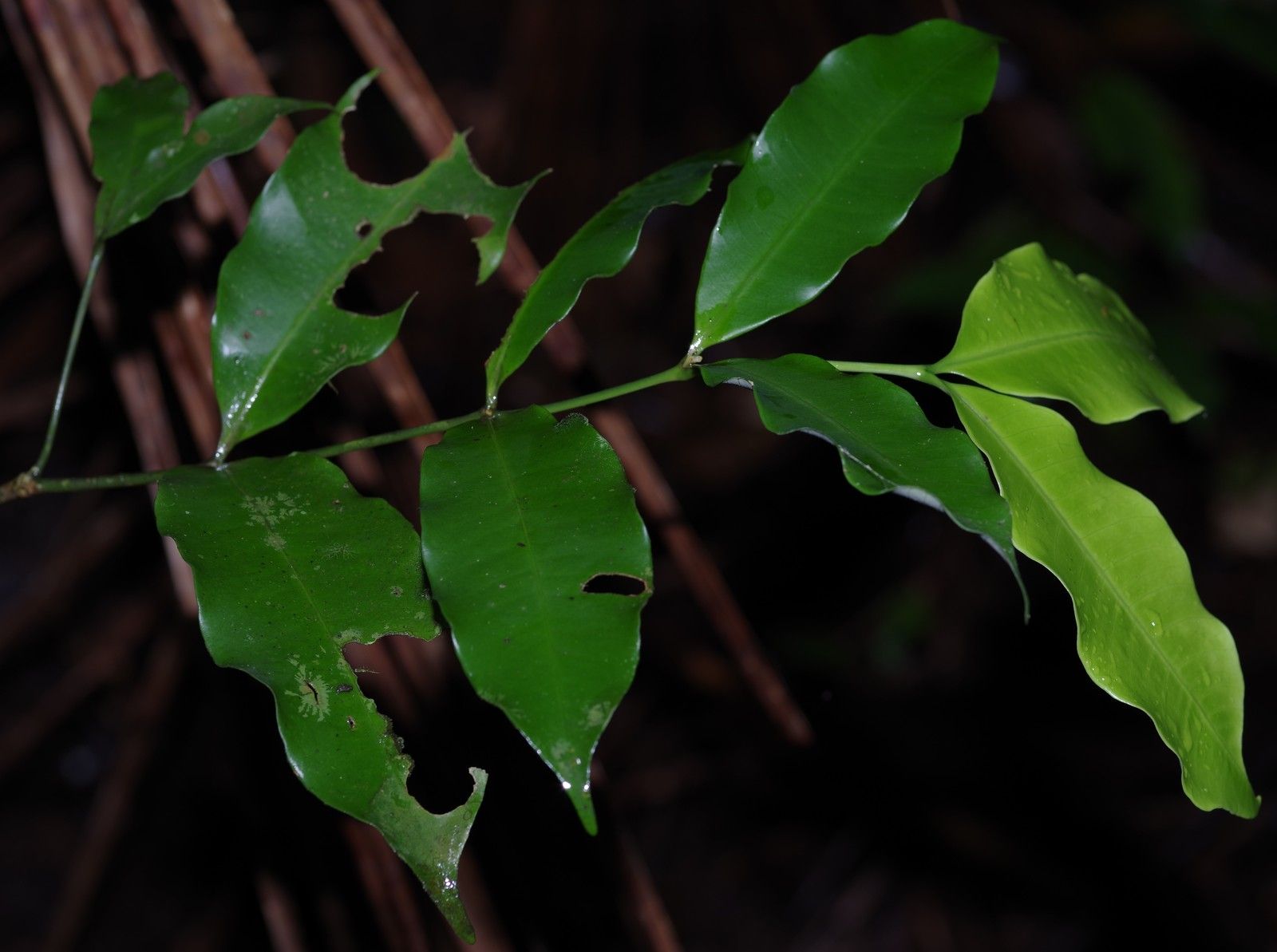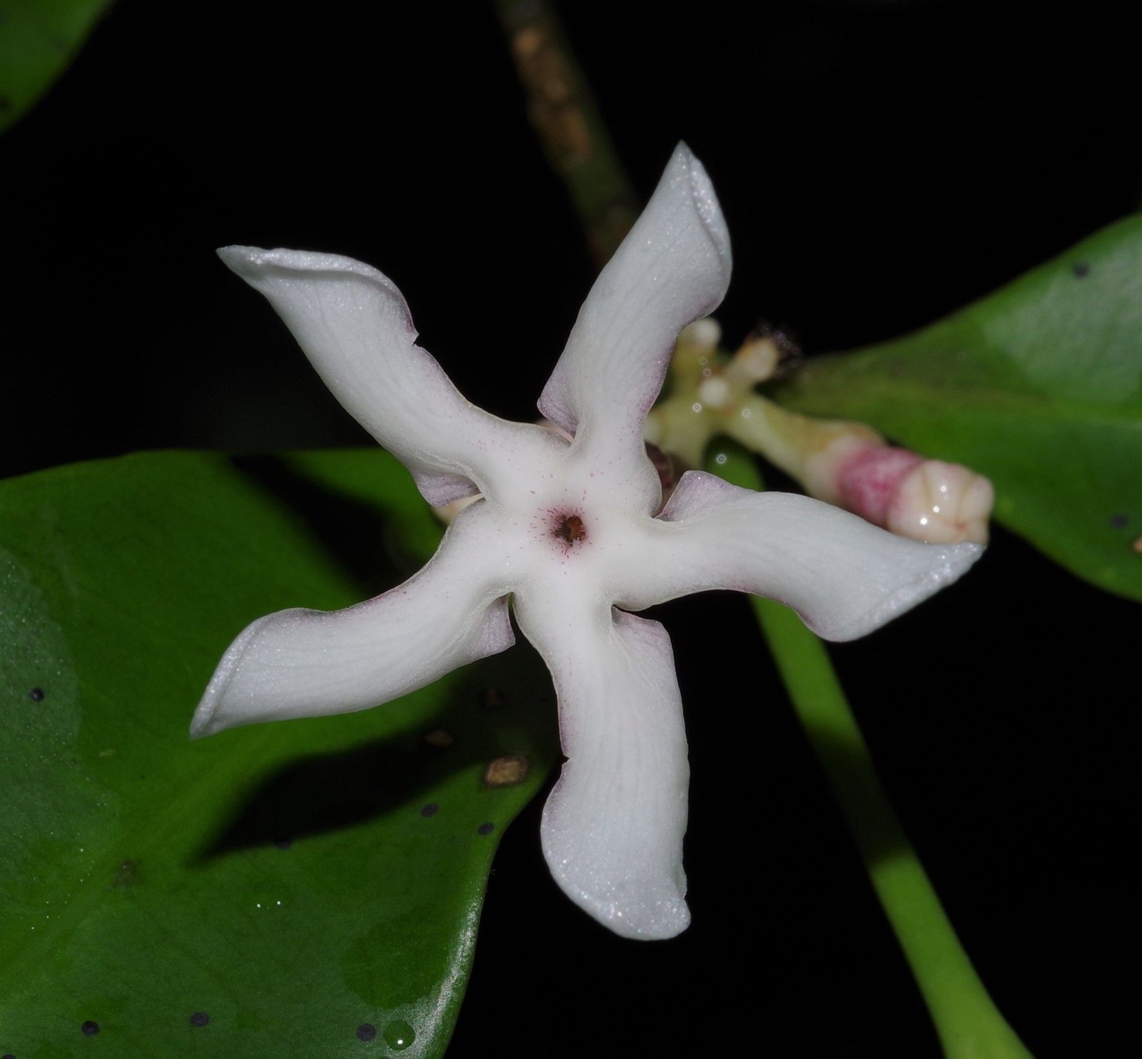 Tabernaemontana undulata , petit arbre jusqu'à 10 m de haut, feuilles courtement pétiolées, limbe discolore oblong à elliptique à marge ondulée, 15 à 20 paires de nervures secondaires parallèles les unes aux autres, fleurs à calice blanchâtre, tube de la corolle rosé sur presque toute sa longueur et lobes blanchâtres étalés, fruits non observés.