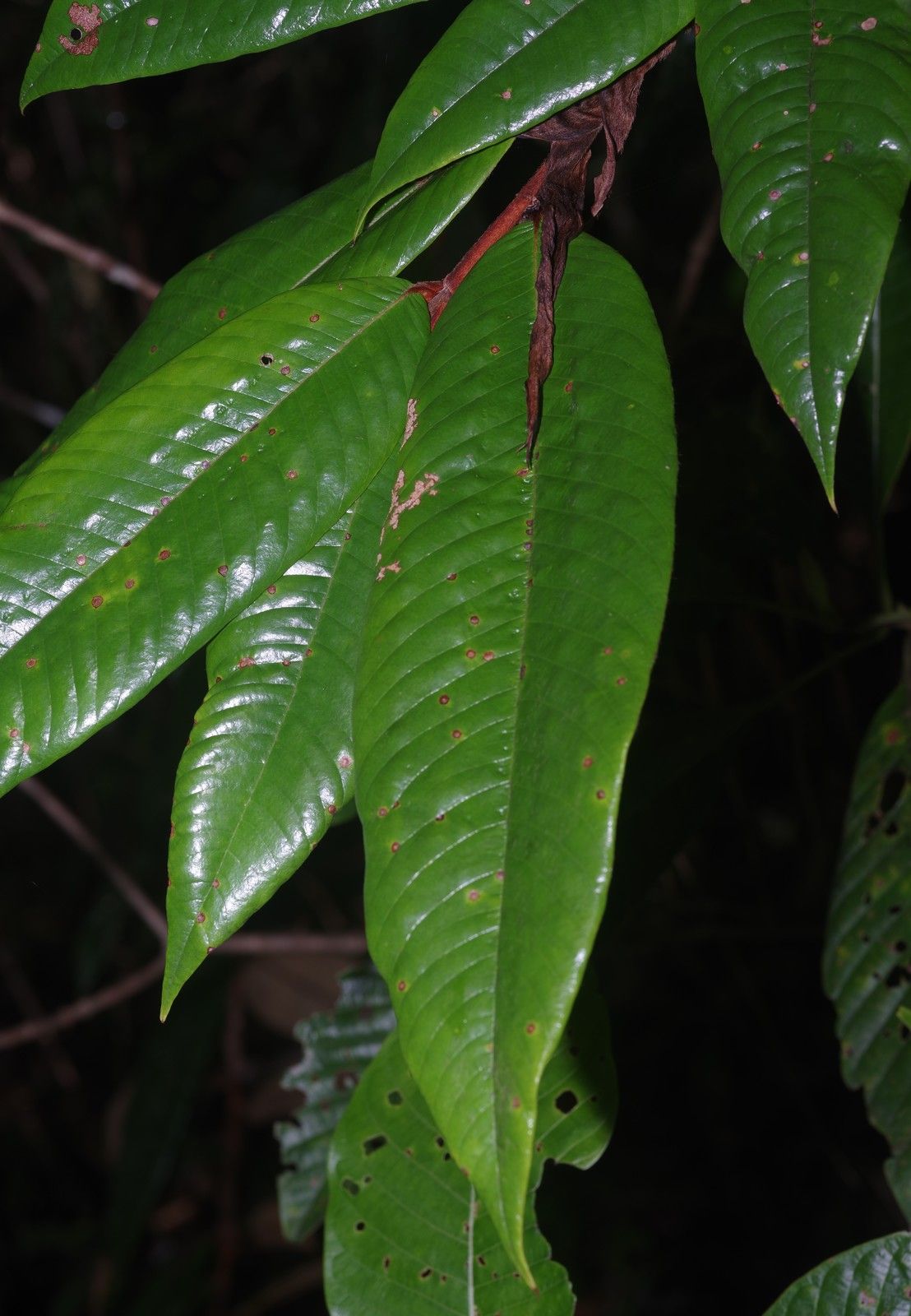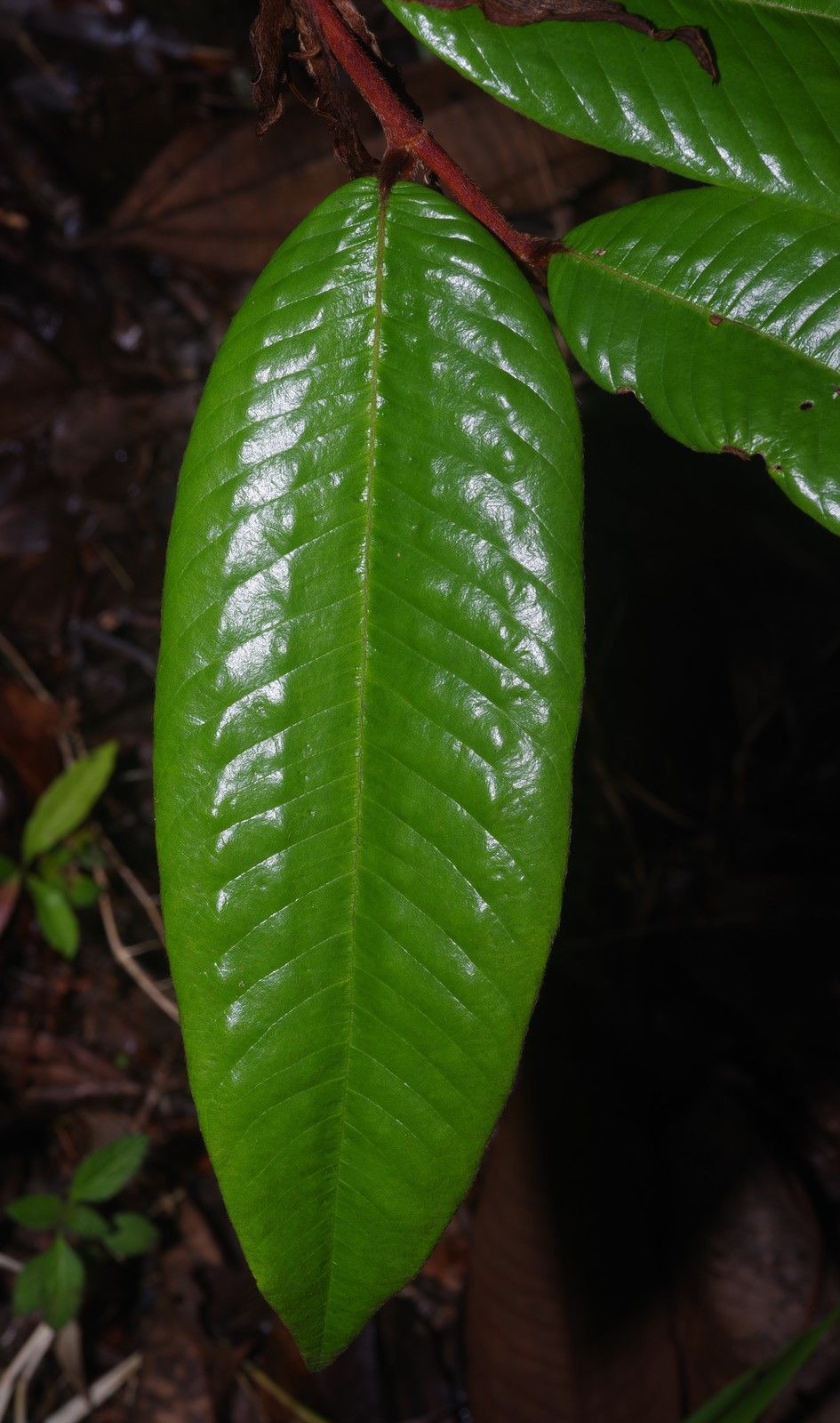 Parinari rodolphii , arbre jusqu'à 40 m de haut, jeunes axes à pubescence roussâtre, longues stipules (jusqu'à 5 cm) peu persistantes, feuilles courtement pétiolées (pétiole de moins d'un cm avec 2 glandes vertes assez peu visibles sous les poils [photos 3 et 4]), limbe étroitement elliptique à lancéolé mesuré jusqu'à 24 x 8,5 cm, vert foncé et glabre dessus, cloqué avec des lignes de ponctuations imprimées parallèlement à la nervure principale, blanchâtre et tomenteux dessous, individu stérile.