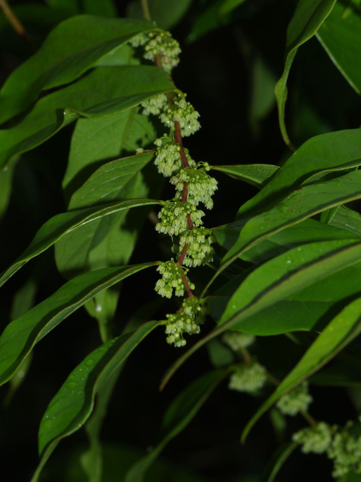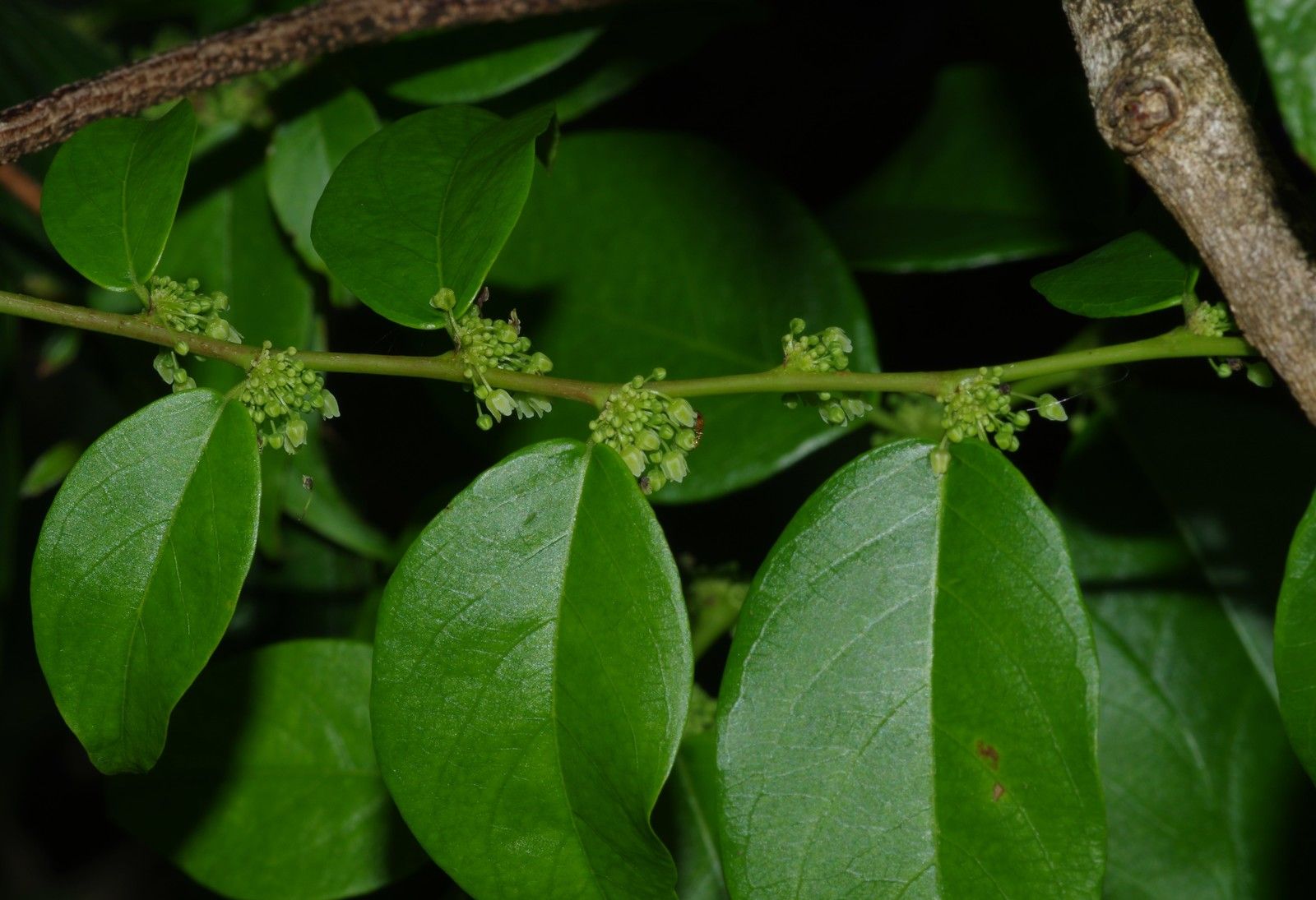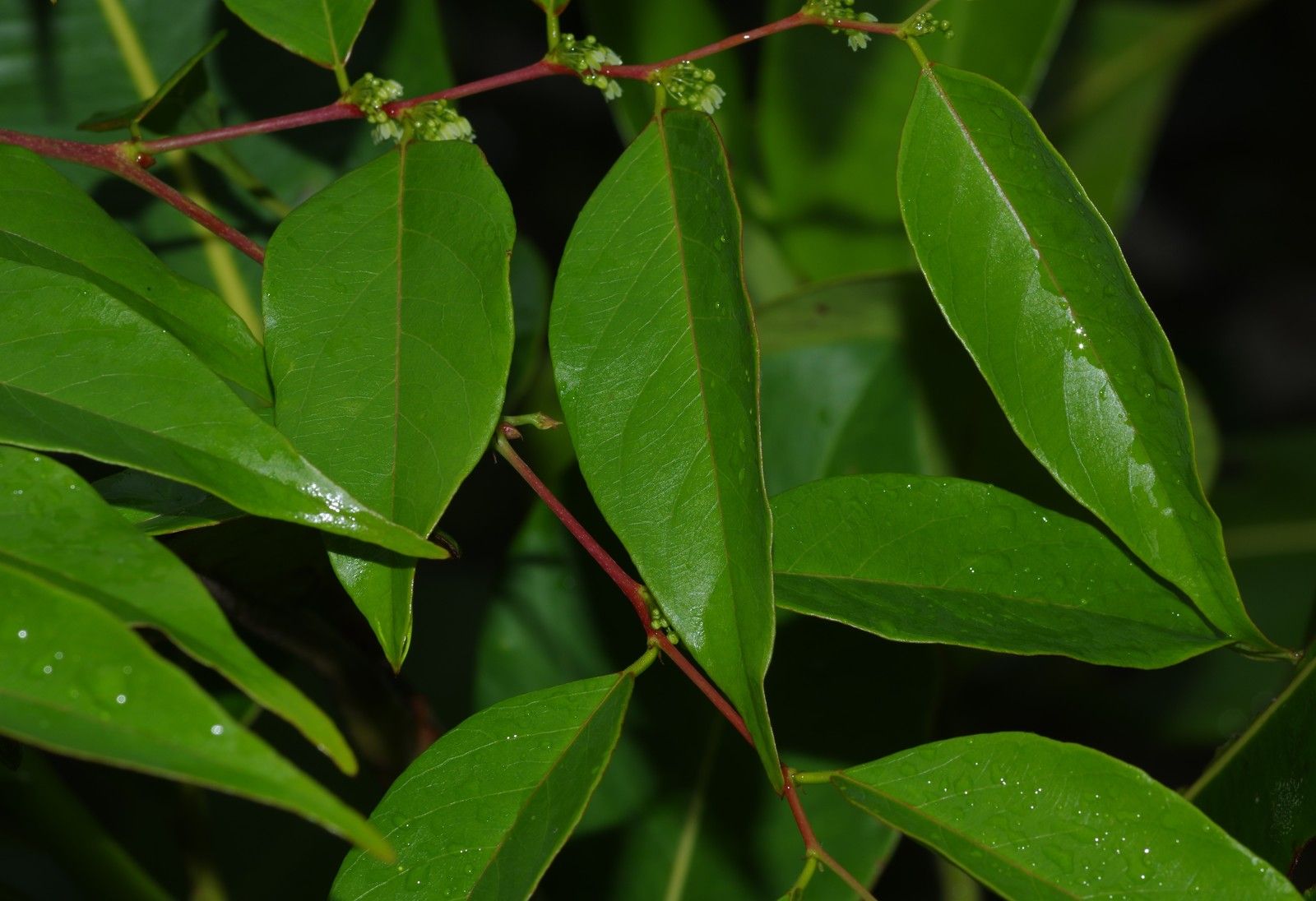 Phyllanthus attenuatus , arbuste ou petit arbre jusqu'à 12 m de haut, feuilles alternes à limbe ové à elliptique longuement acuminé, inflorescences axillaires à nombreuses fleurs verdâtres fasciculées.