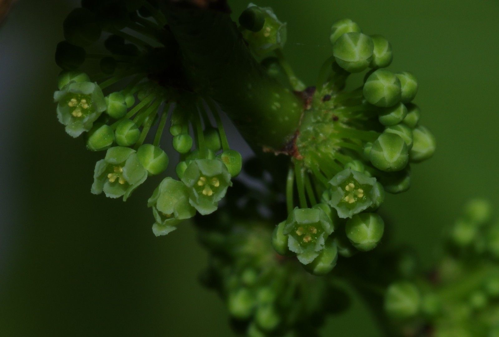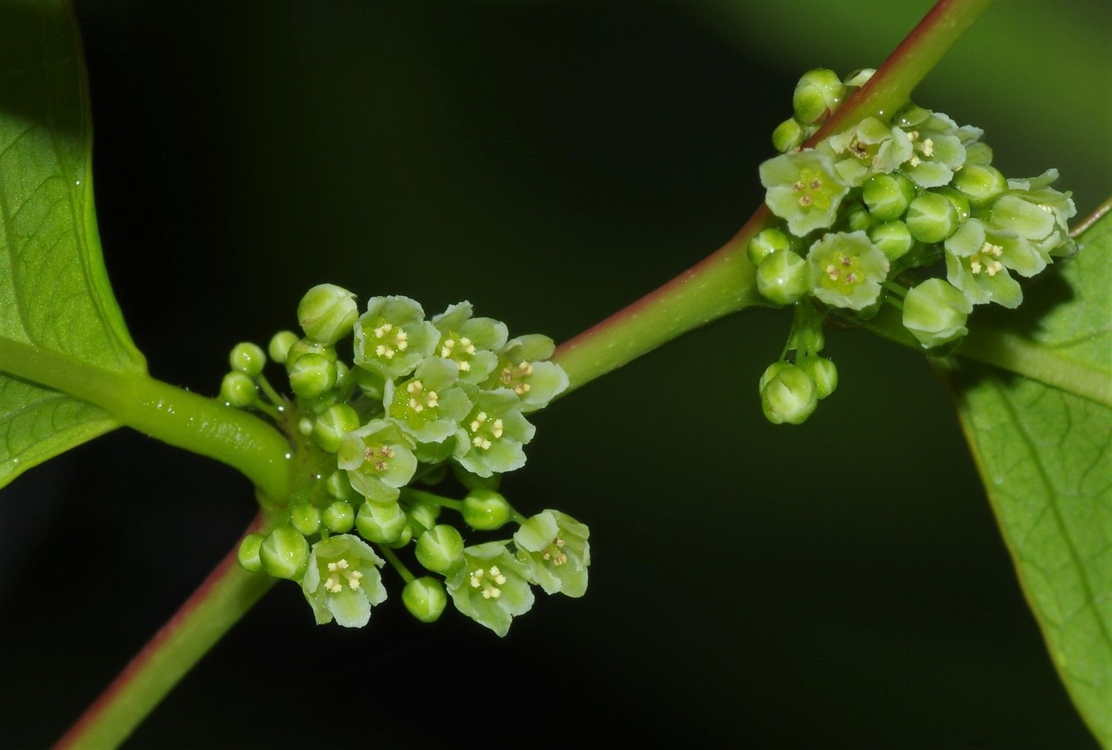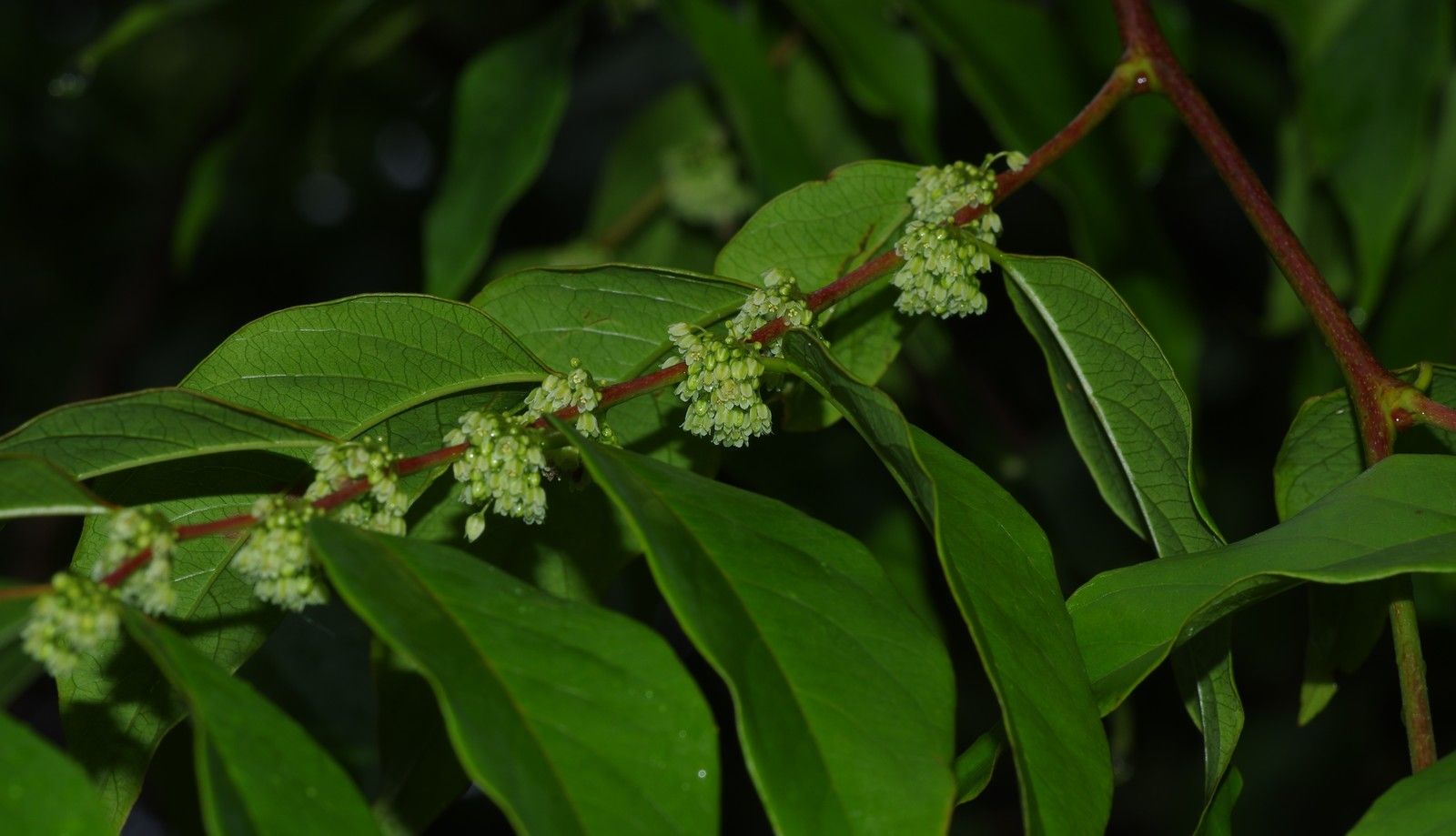 Phyllanthus attenuatus , arbuste ou petit arbre jusqu'à 12 m de haut, feuilles alternes à limbe ové à elliptique longuement acuminé, inflorescences axillaires à nombreuses fleurs verdâtres fasciculées.